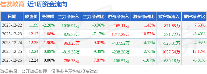 资金流向数据方面,本周佳发教育主力资金合计净流出931.93万元,游资资金合计净流入599.72万元,散户资金合计净流入332.21万元。本周资金流向一览见下表: