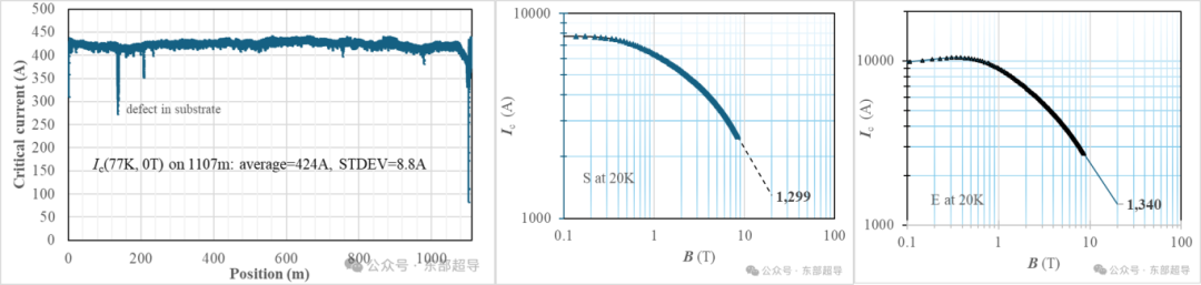 会议期间,东部超导做了关于“MOCVD技术在可控核聚变用2G-HTS产业化性能指标新突破”的学术报告,并正式推出东部超导2G-HTS专用于低温高场下的HF系列产品中的HF1200型号产品。该产品由超导权威专家陈一民博士团队历时一年多攻关而成,是适配可控核聚变场景的千米级REBCO超导带材,其核心性能指标经检测结果为:12mm 宽、长度达1107 米的 HF1200 带材,在77K、0T 环境下平均临界电流(Average Ic)达 424A,标准差仅8.8A,凸显出极强的性能稳定性;通过物理性能测量系统(PPMS)测试及外推计算,该带材两端样品在20K、20T 且磁场平行于 c 轴(B∥c)条件下,临界电流分别达到 1299A 与1340A,该指标在目前已发布文献可批量化制备REBCO带材中实现历史性重大突破。